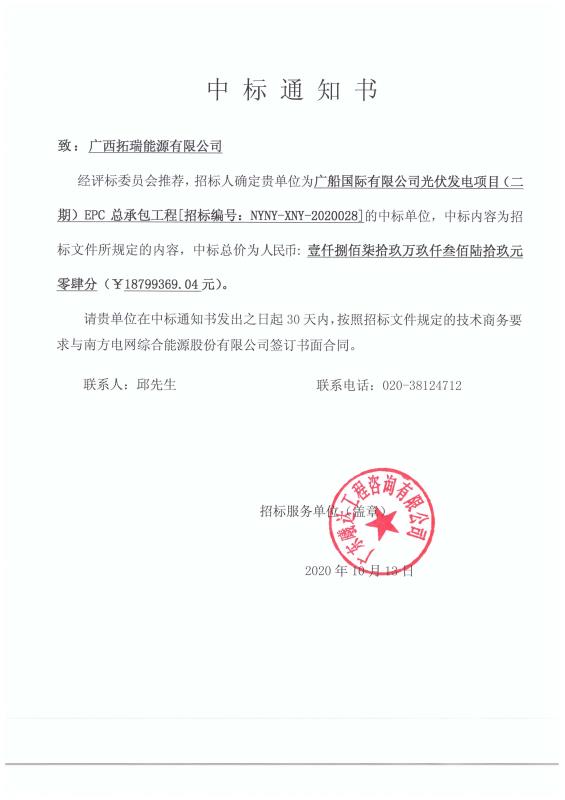 近日,我司喜訊接踵而來。繼9月30日中標廣西院田林定安60MW農(nóng)業(yè)光伏項目光伏區(qū)建筑與安裝工程分包采購項目后,10月13日,我司又成功中標廣船國際有限公司光伏發(fā)電項目(二期)EPC總承包工程。
